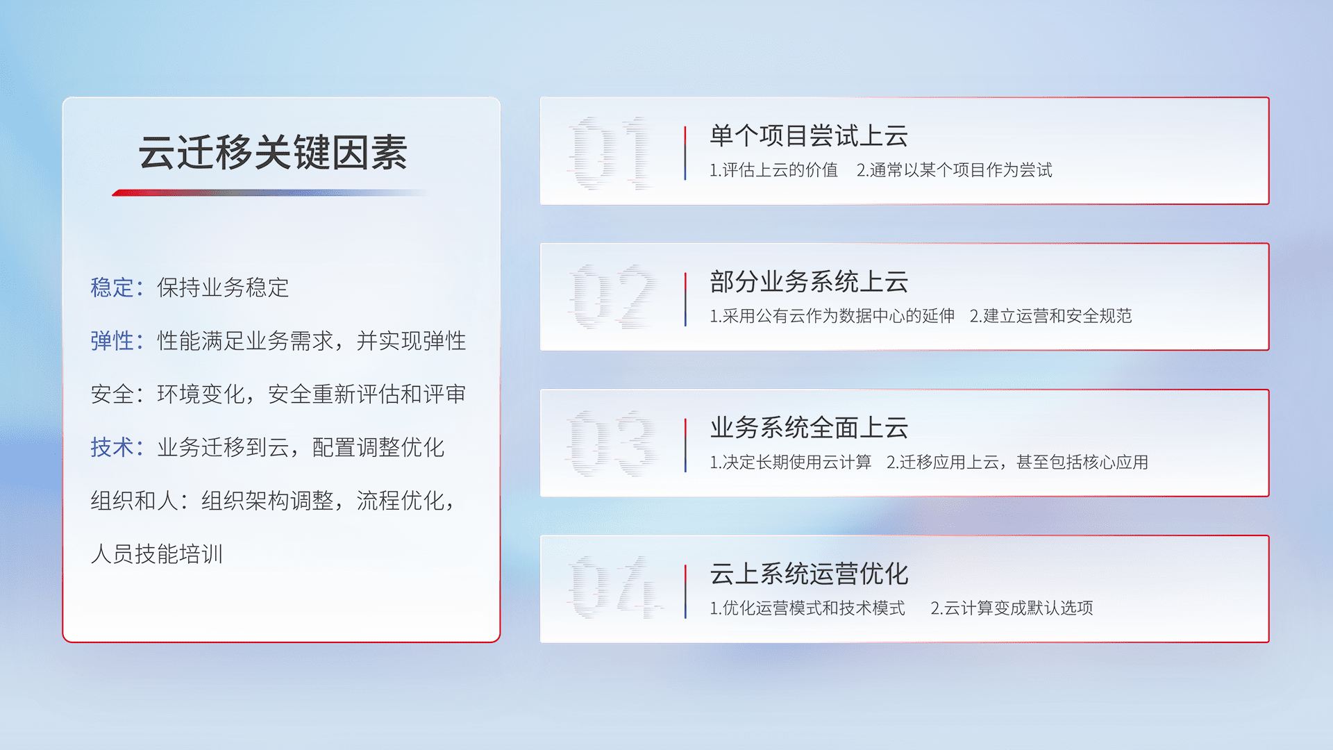 结合实际业务,,从规划设计、、、、云平台选型、、、、云原生改造、、、、数据迁移、、集成交付,,,迁移全过程为客户识别最佳上云路径,,做好风险识别管理,,设计网络架构、、身份权限、、、安全审计合规、、、、操作审计、、、日志审计、、、监控告警策略、、多站点容灾设计等,,对云上基础设施进行整体规划,,,提升IT治理水平,,以满足弹性、、高可用、、、、高性能的需求。。。。