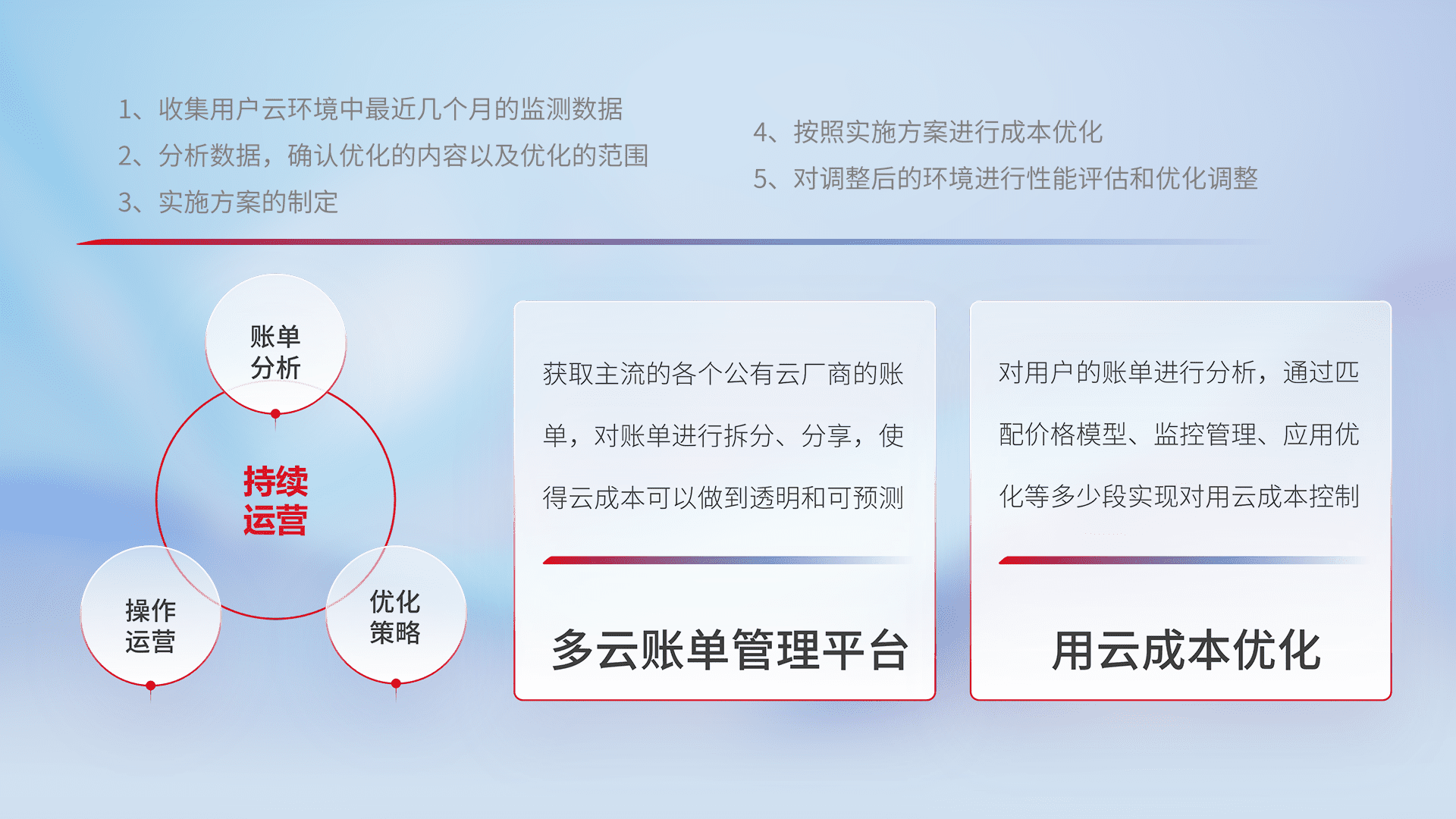 通过多云纳管,,,,以统一的资源数据模型把客户的云资源进行抽象和封装,,,进而实现对多云资源的统一操作,,保障云资源管理的可靠性、、、、稳定性与可用性。。量身定制化运维内容,,配置、、开发运维、、、补丁管理、、、备份、、监控、、认证和访问管理、、、审计和日常巡检等,,保障在用云过程中的可靠度,,,稳定度以及高可用率。。