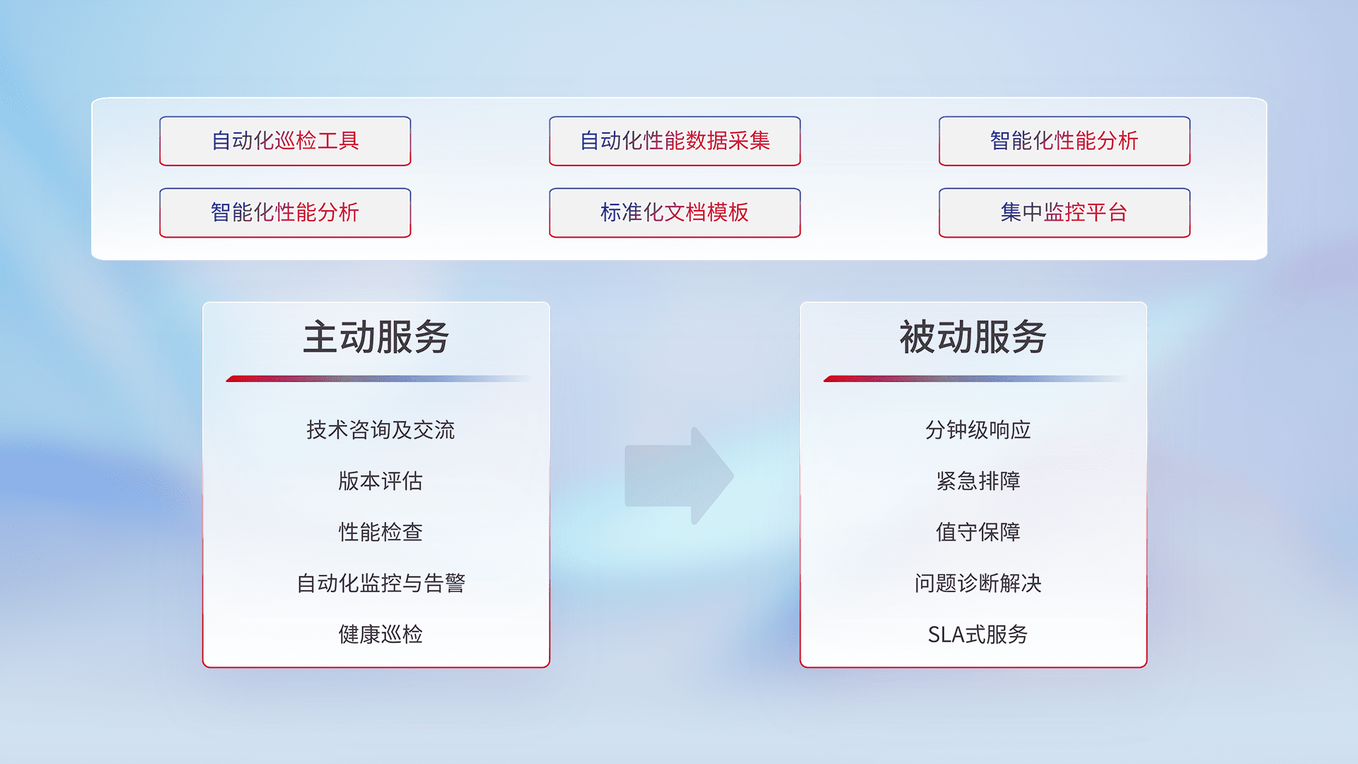 智能化工具和标准化文档,,,保障服务质量,,提供主动服务(包含技术咨询、、、版本评估、、性能检查、、自动化监控与告警、、、健康巡检)和被动服务包含(分钟级响应、、、、紧急排障、、、、值守保障、、问题诊断解决、、SLA服务)。。。。