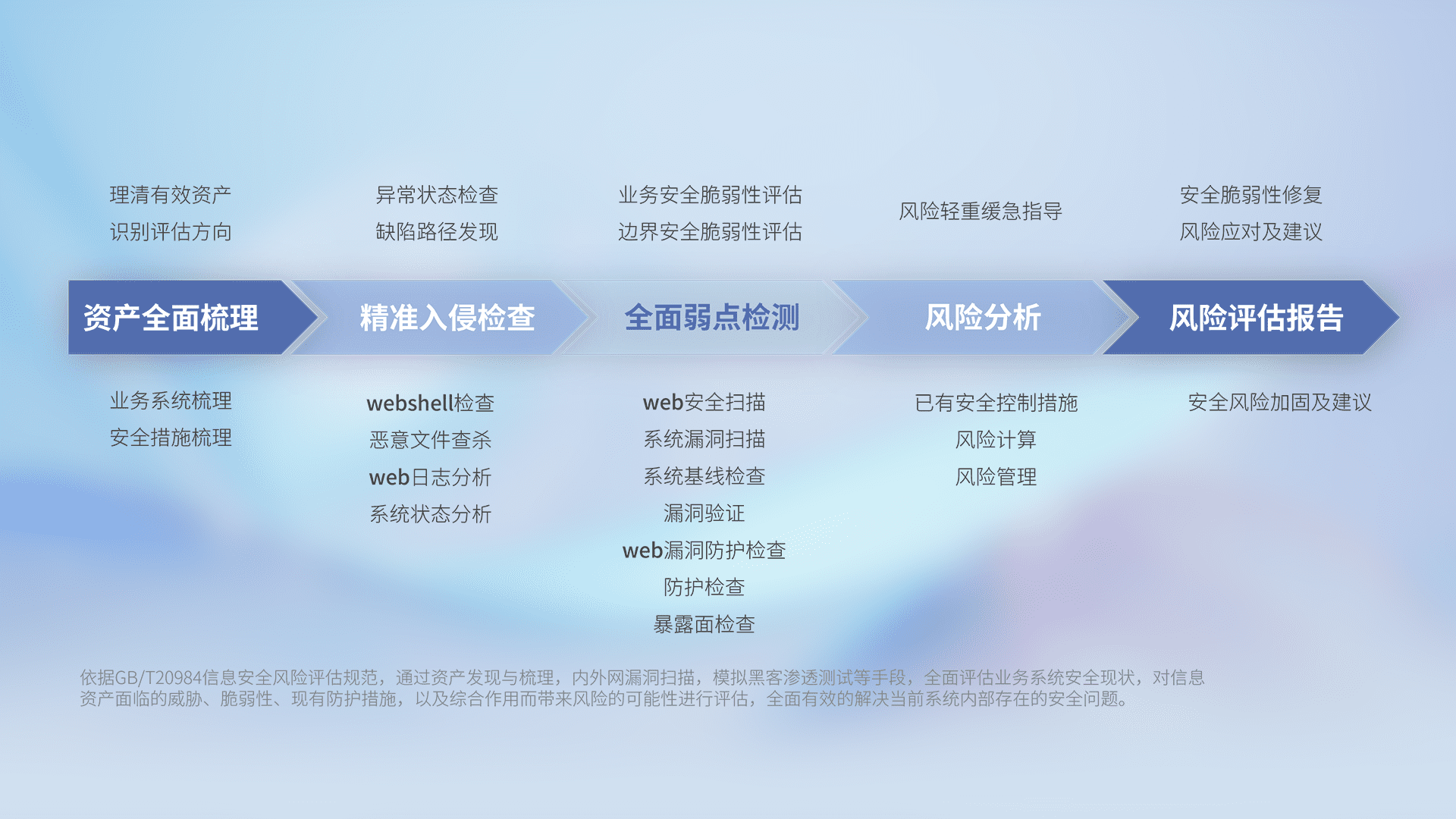 针对客户行业特性,,,,以专业的安全服务+多厂商联合解决方案提供专属的一站式安全管理服务,,帮助客户全面感知网络空间威胁,,,,基于识别、、、检测、、分析、、、、防护、、、监测、、、响应的服务理论模型,,从方案咨询、、、集成交付、、、、评估验证、、优化加固、、运维运营,,,致力于为客户提供完整的闭环管理式安全服务。。以实战经验为客户打造高抵御风险的安全体系,,,帮助客户发现威胁、、、、对抗威胁、、处置威胁,,,,不断积累安全对抗能力,,,,持续保障数字化安全。。。